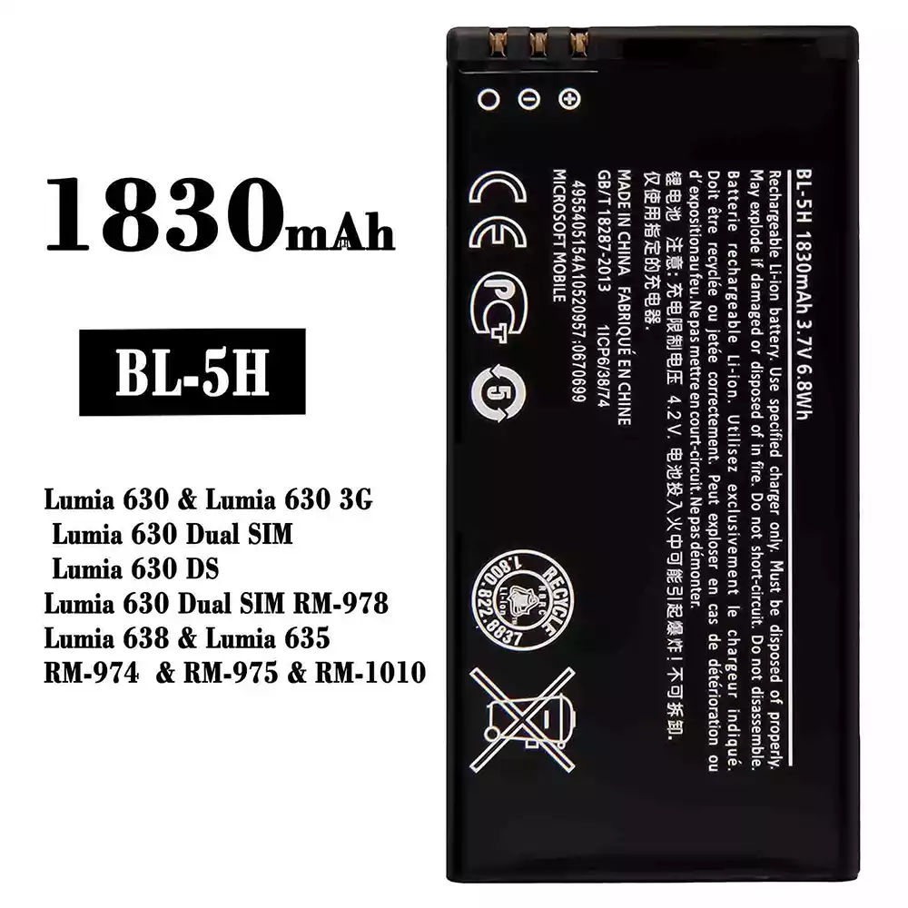 Batterie BL-5H pour Nokia Lumia 630 / Lumia 630 3G / Lumia 630 Dual SIM / Lumia 630 DS / Lumia 630 Dual SIM RM-978 / Lumia 638 / Lumia 635 / RM-974 / RM-975 / RM-1010